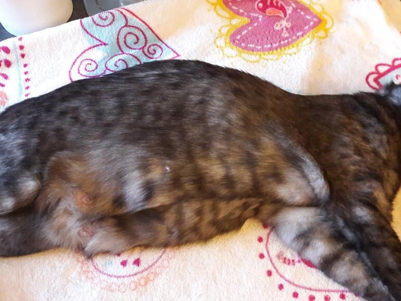 Om 18.30 's avonds brak haar water en kon het echte werk beginnen. Om kwart over 7 was het eerste kitten er. Het piepte reeds onmiddellijk maar het hing nog achteraan aangezien de placenta er nog niet uit was. Biba maar draaien en draaien want ze hoorde haar kitten maar begreep niet waar. Ze deed alles zelf. Een pracht van een bevalling. Even later lag ze rustig te ronken met haar 3 katertjes.