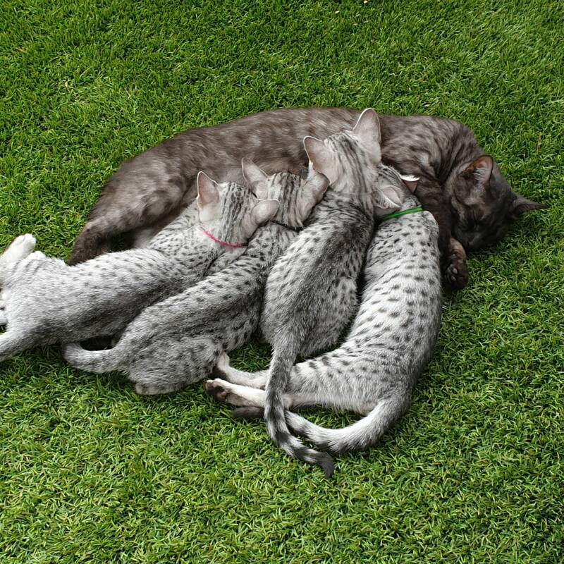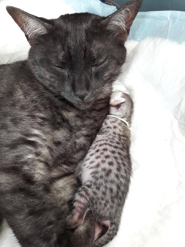 Biba was echt een ronde ton tegen het einde van haar zwangerschap. Ze was 1,65KG bij gekomen. Op dag 68 was het zover. Ze beviel in de voormiddag. Dat was super fijn omdat ik zo de toekomstige baasjes mee op de hoogte kon houden van de vorderingen. 4 kleine wondertjes, 3 poesjes en 1 katertje, zagen het levenslicht.