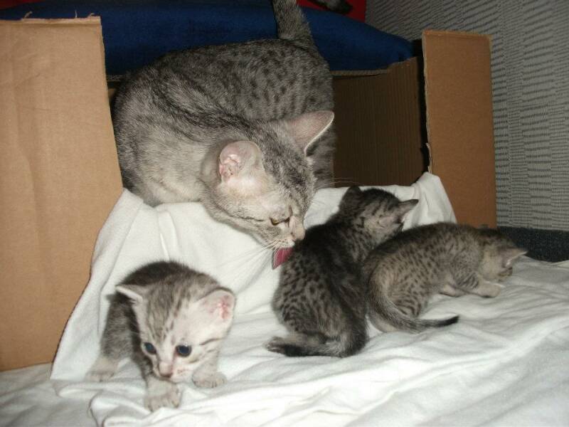 Ons allereerste nestje. Dat was best spannend. In het midden van de nacht begon Milou er aan. Rond 04 u hoorde ik een piep waarvan ik wakker werd. Haar eerste kitten was reeds geboren en lag voor de bevallingsdoos. Ik legde het onmiddellijk bij Milou en haar instinct schoot in gang. Nummer 2 en nummer 3 volgden vlot nadien. Het duurde wel enkele dagen vooraleer we wisten welke geslachten het waren. Het was 1 poesje en 2 katers.