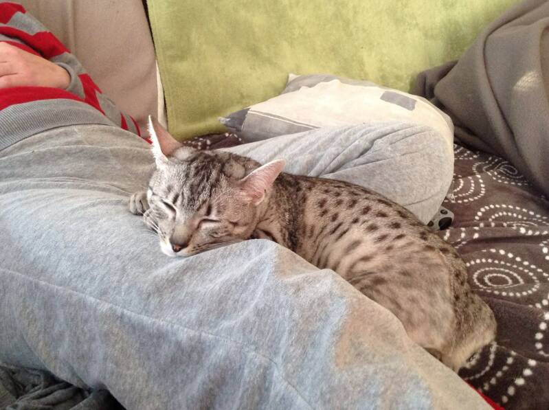 Fémi is de dochter van Milou. Haar naam komt van féminin, vrouwelijk. Fémi en haar 2 zusjes zijn verwekt nadat Milou hersteld was van een baarmoederontsteking. Waarschijnlijk zat er toch nog iets van bacterie in haar baarmoeder waardoor de 3 kittens een misvormde staart hadden. Dat was op zich nog niet zo erg. Helaas moesten we te snel afscheid nemen van haar 2 zusjes omdat er inwendig toch iets mis was bij hen.